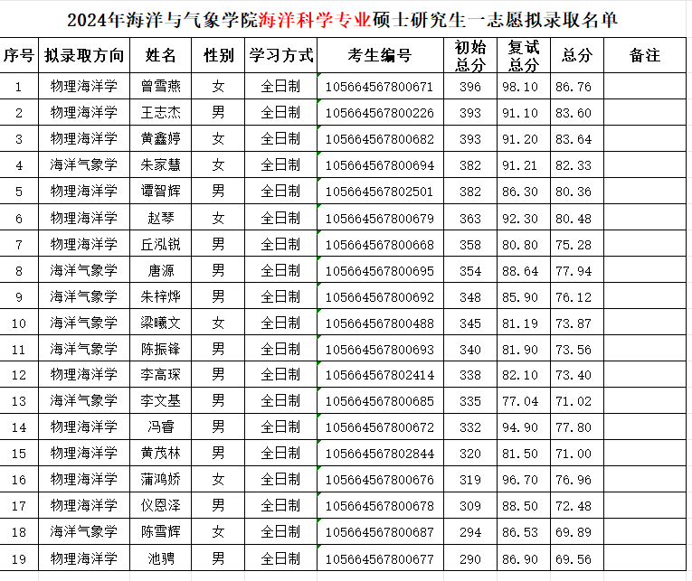 现将365英国上市公司在线海洋科学专业2024年硕士研究生一志愿及调剂拟录取学生名单予以公示,公示期为3个工作日,即4月26日-4月28日。公示期内如对结果有异议,可以书面形式向学院予以提出。